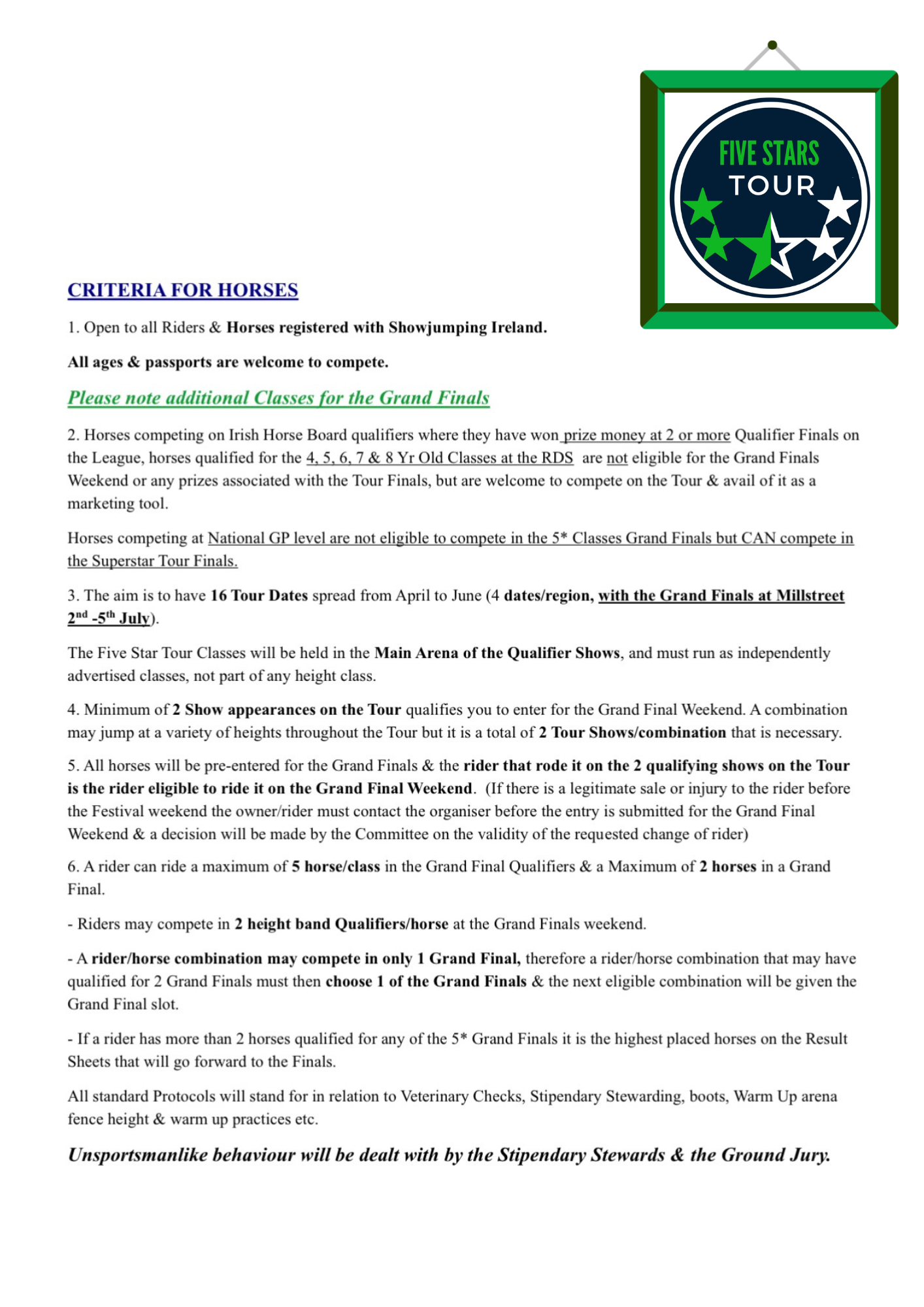 Criteria for the Five Stars Tour